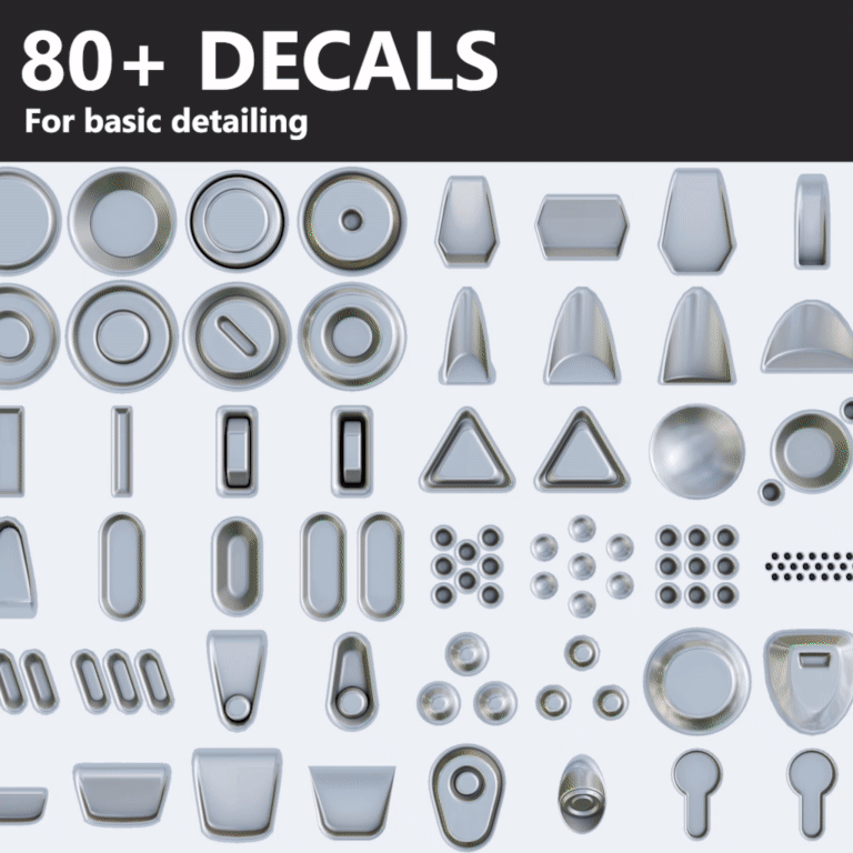 This is a set of 80+ decals, compatible with DECALmachine. They have been designed as basic detailing shapes that always come in handy when you need to quickly add detail to your meshes.